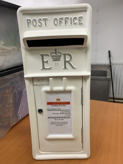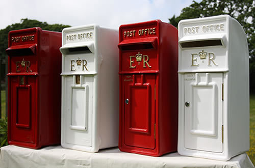 Add that extra-special touch to your wedding day by hiring one of our instantly recognisable and personalised vintage ER Post Boxes. It is increasingly common for wedding guests to give money and vouchers in a card as a wedding gift and nothing is more instantly recognisable (or secure) as a lockable Post Box to put them in. This ER Post Box –is an ideal retro choice for your gift table, measuring 59cm high x 25cm wide x 36cm deep. The post box will be personalised on the front door with name of bride and groom, date of your wedding ceremony and venue in the original Post Office style to match your post box (which you may keep as a memento). The post box is very secure and is supplied with a set of keys.
